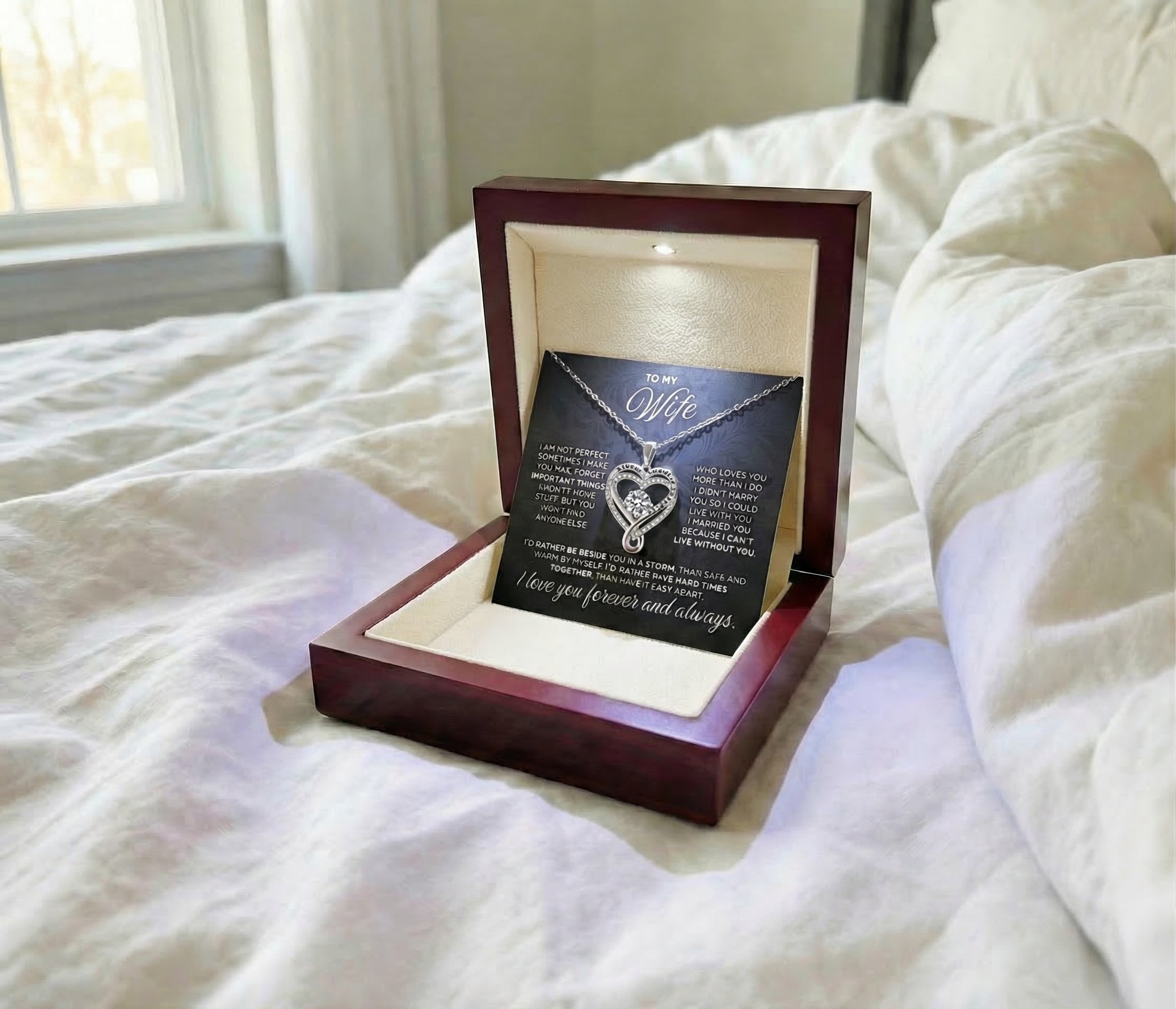 Each order includes the necklace, a message card, and your selected gift box option (standard or LED).